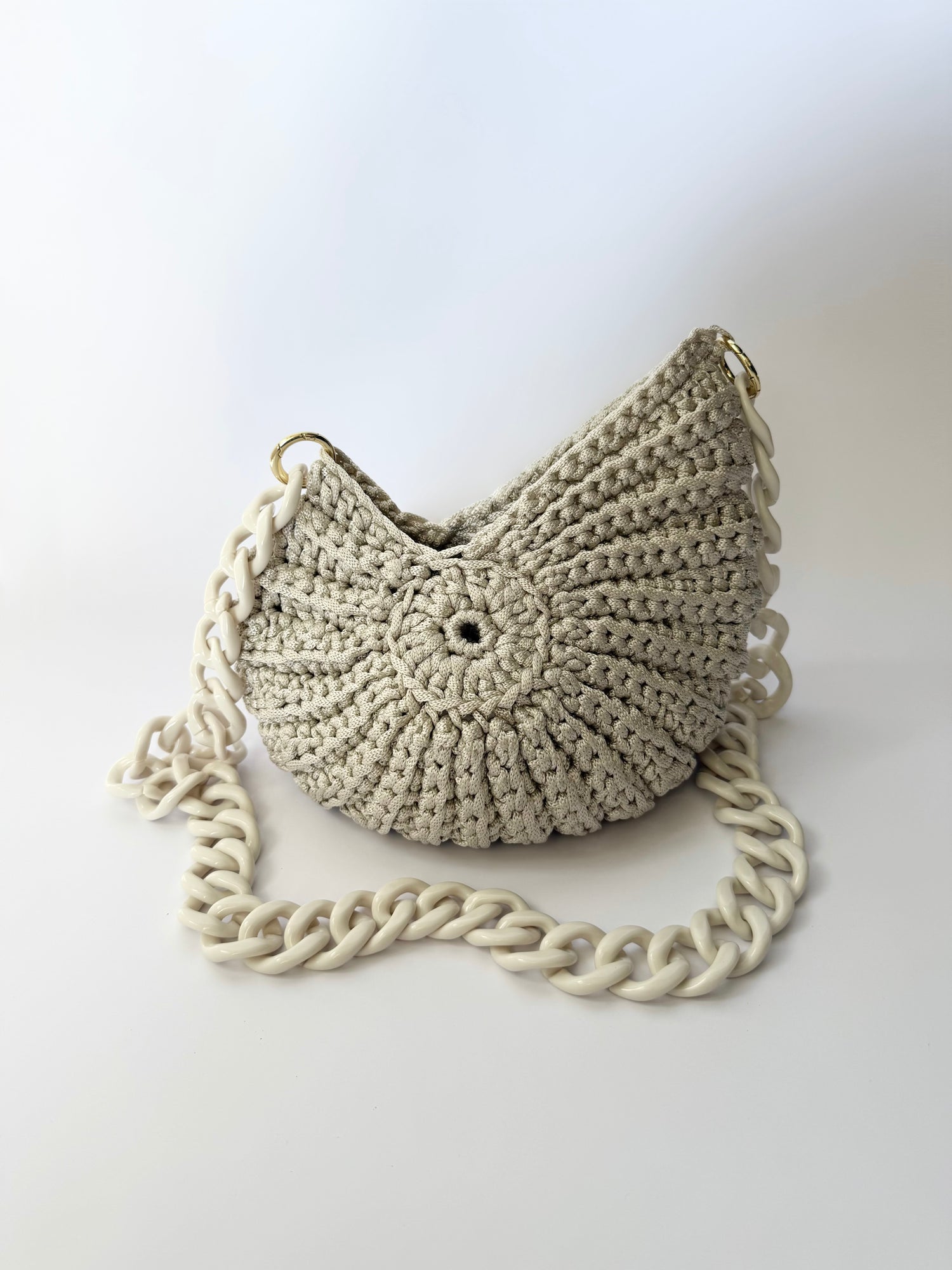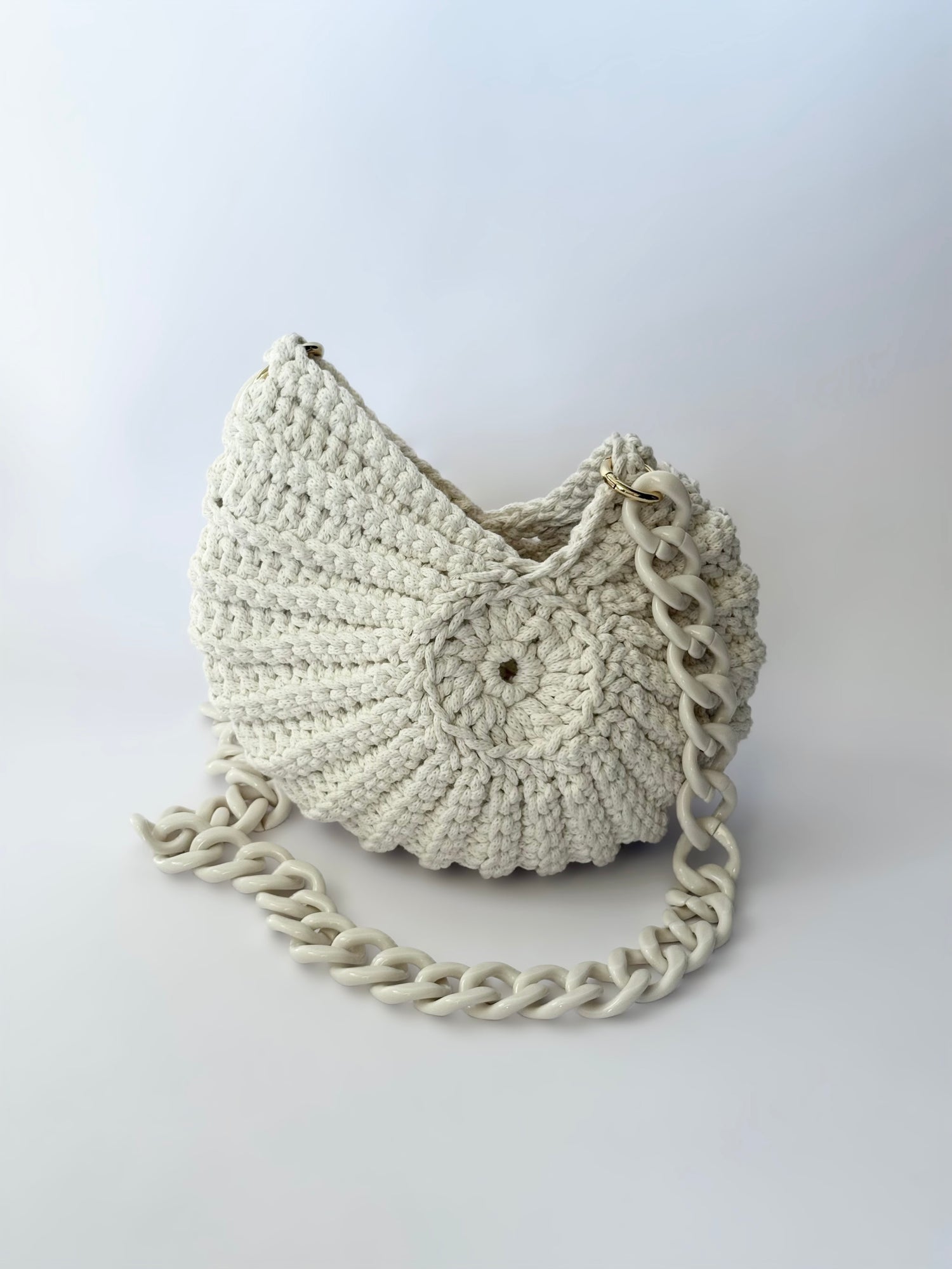 Il design a conchiglia lavorato all’uncinetto incontra la catena in plexiglas, per un look contemporaneo ma sognante e aggiunge un tocco marino pur mantenendo uno spirito urbano, ad ogni tuo look.
