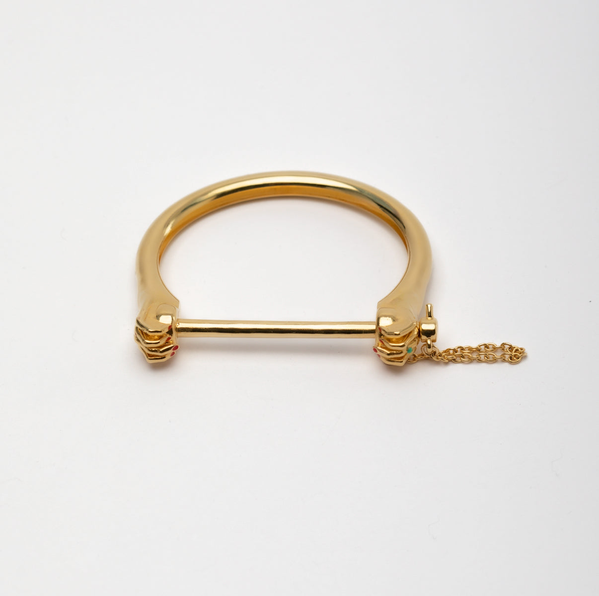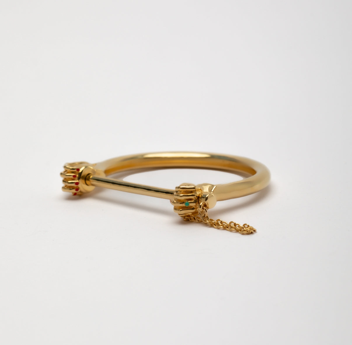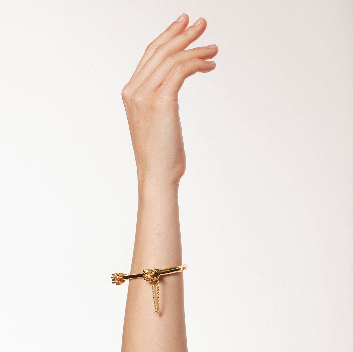 Questo bracciale reinterpreta la forma della manetta con un dettaglio scultoreo: la chiusura è affidata a una barretta con due mani in miniatura poste alle estremità. Una delle mani nasconde al suo interno un magnete, che permette di aprire e chiudere il gioiello con un semplice gesto, trasformando un meccanismo tecnico in un dettaglio simbolico e raffinato.