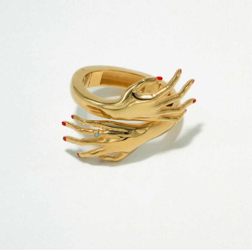 Un intreccio di mani dorate che si avvolgono come in un abbraccio,si apre con una molla, non richiede misure ed è comodo da indossare.