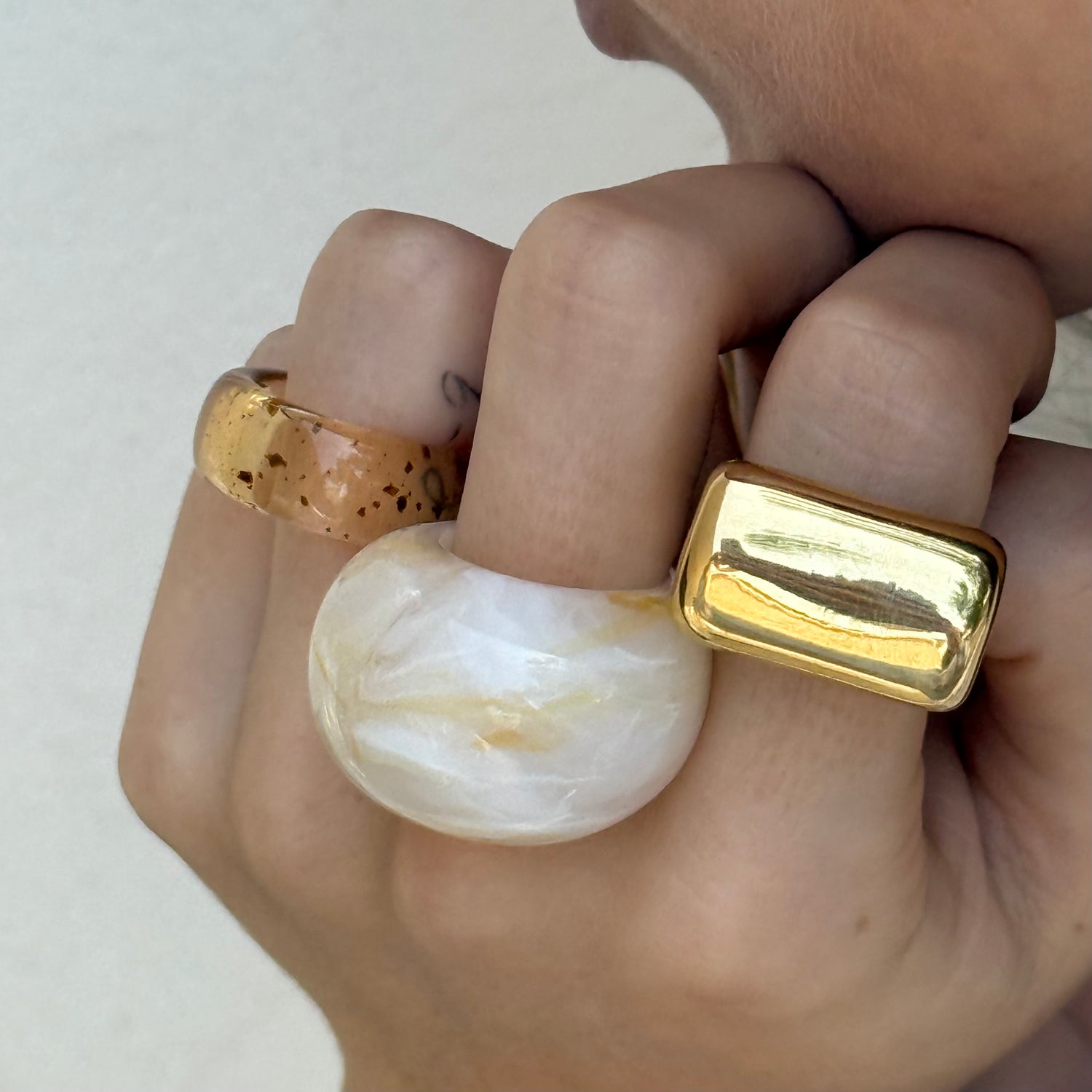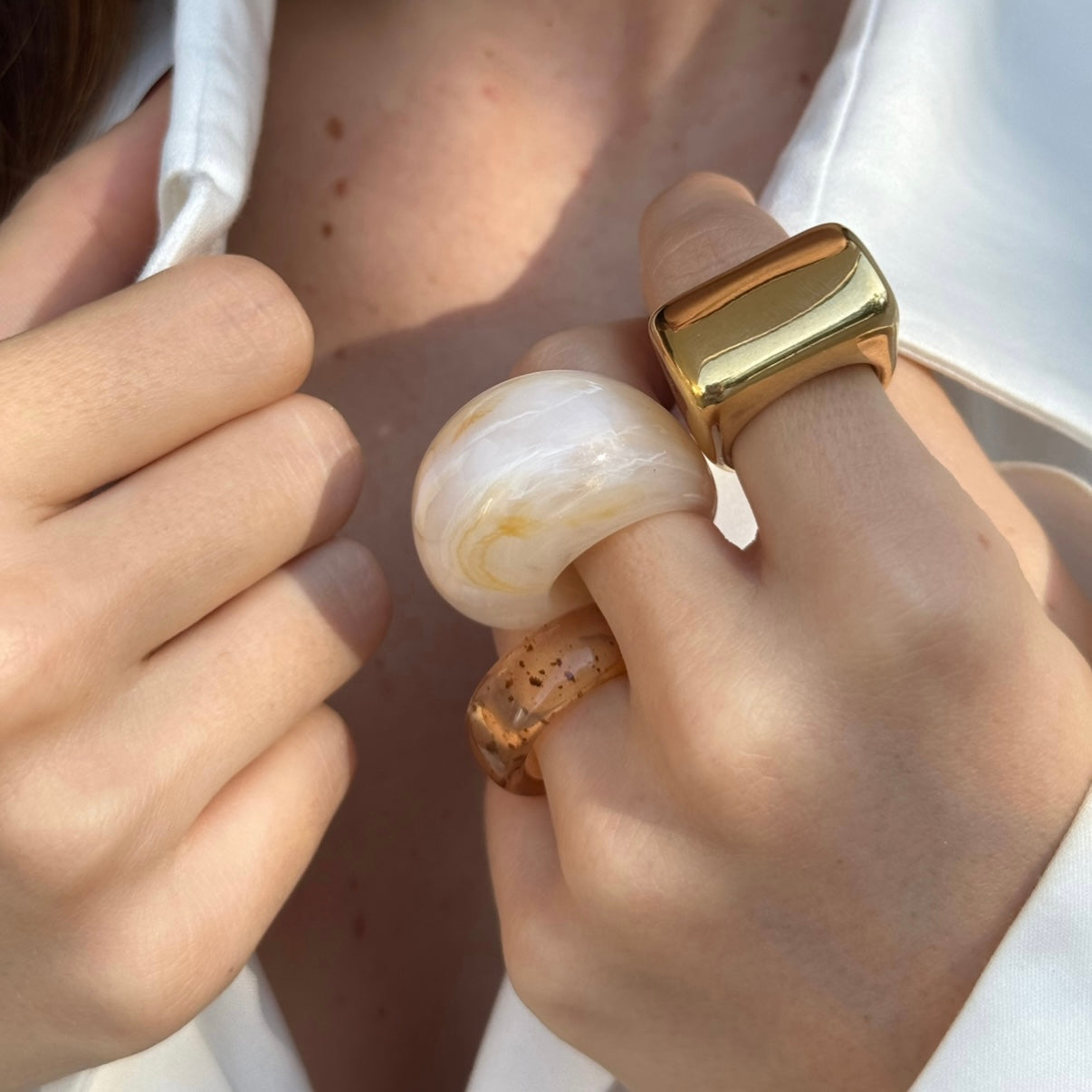 I tre anelli Alek sono realizzati interamente in plexiglass, con finiture diverse che ne esaltano l’unicità: uno con placcatura in oro 18k, uno con effetto madreperla avorio, e uno con riflessi miele e sfumature ambrate.