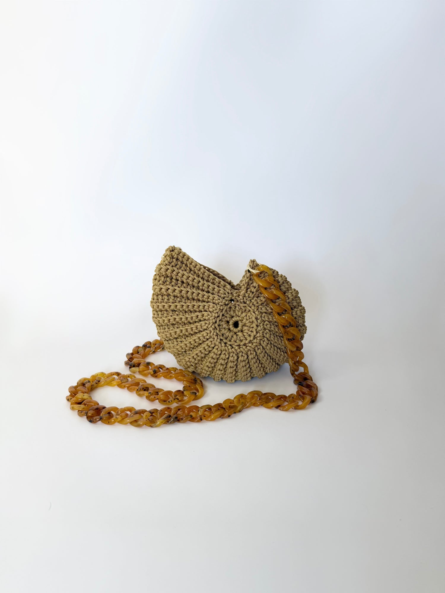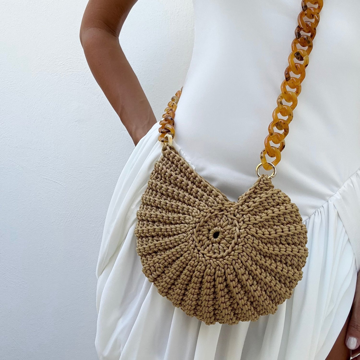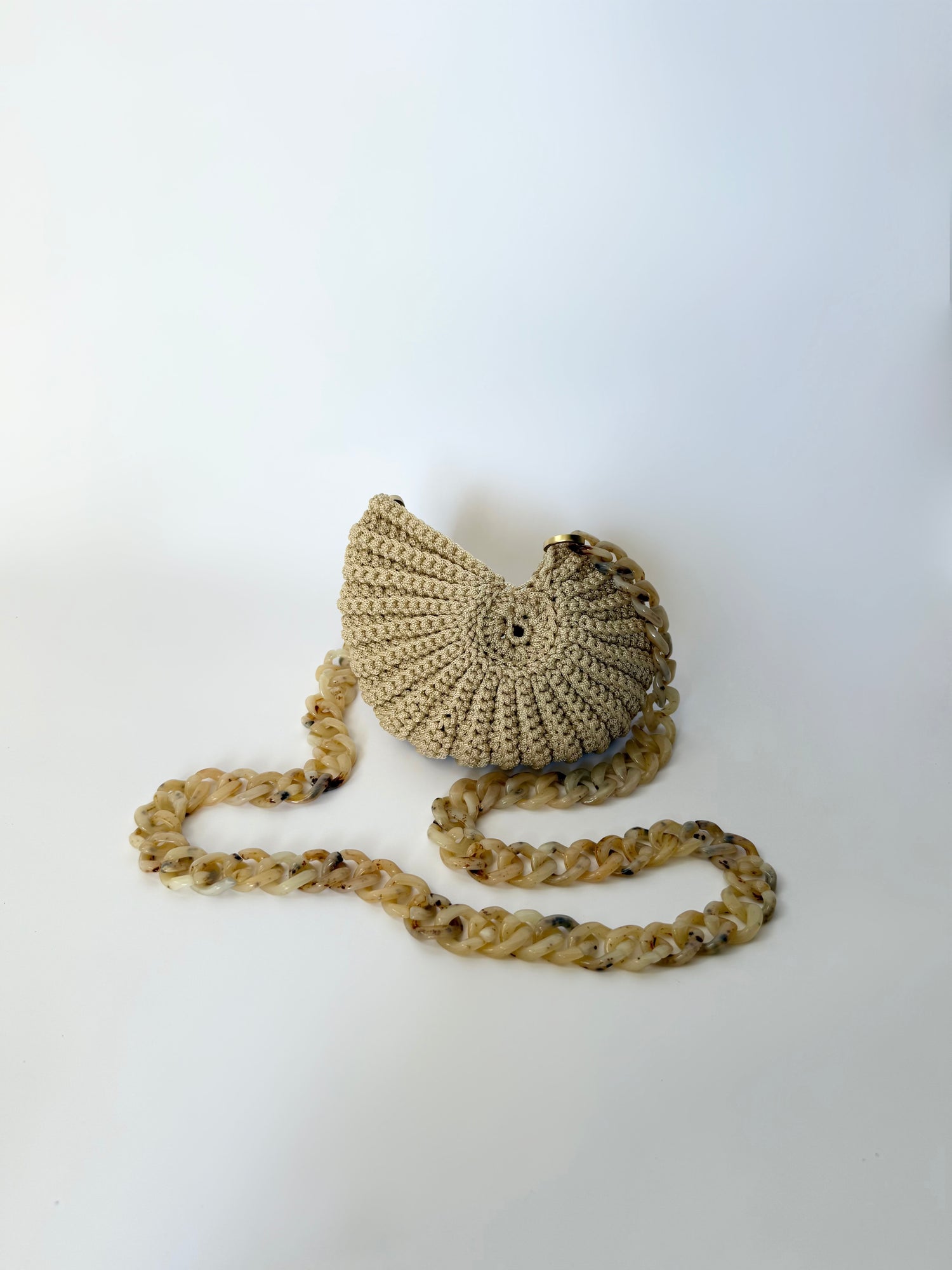 Il design a conchiglia lavorato all’uncinetto incontra la catena in plexiglas, per un look contemporaneo ma sognante e aggiunge un tocco marino pur mantenendo uno spirito urbano, ad ogni tuo look.