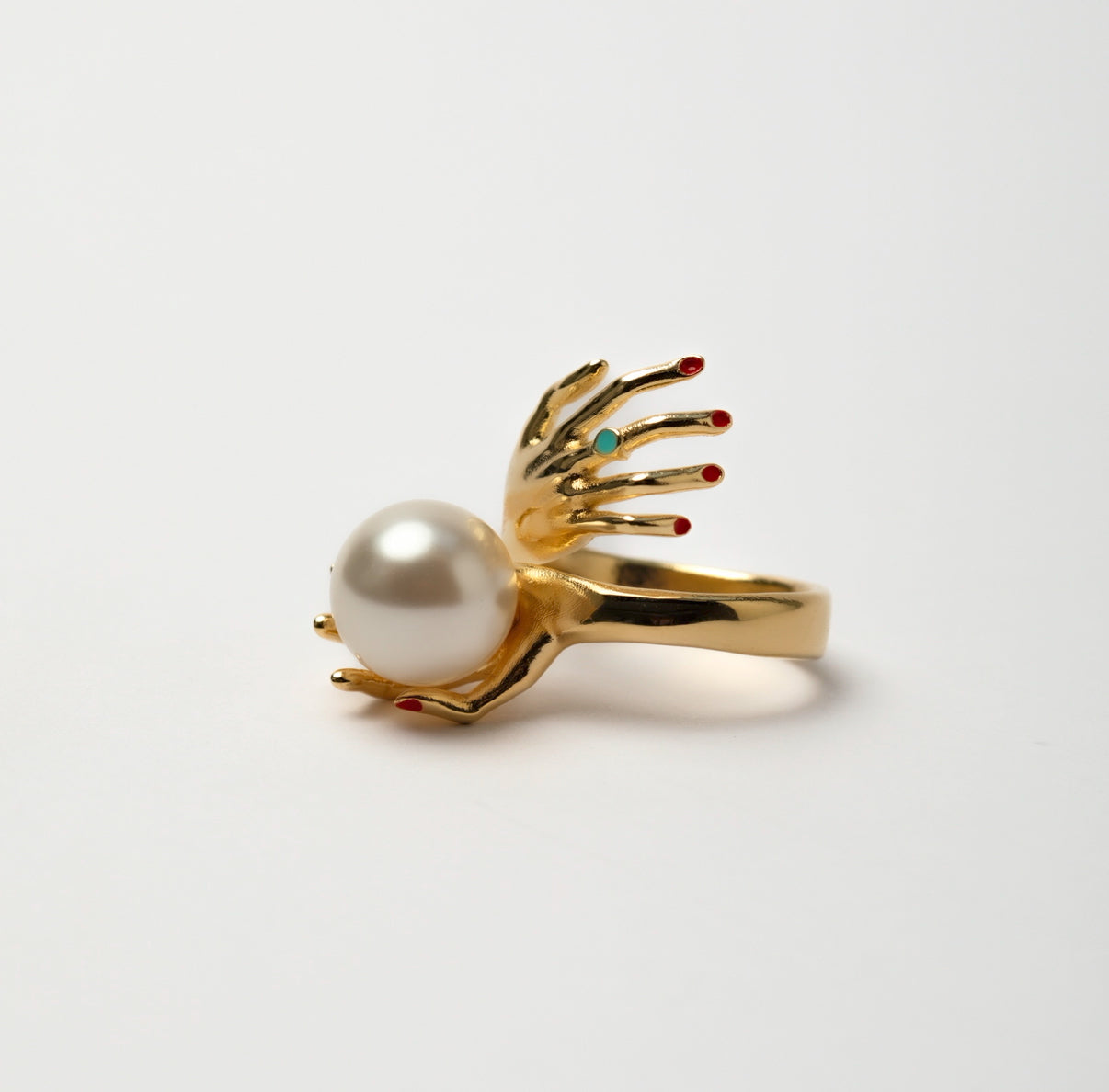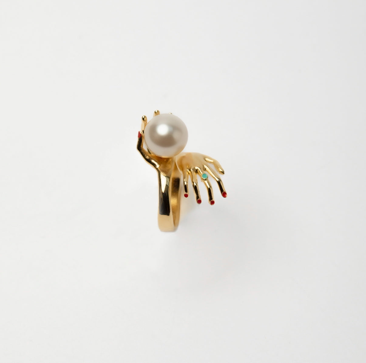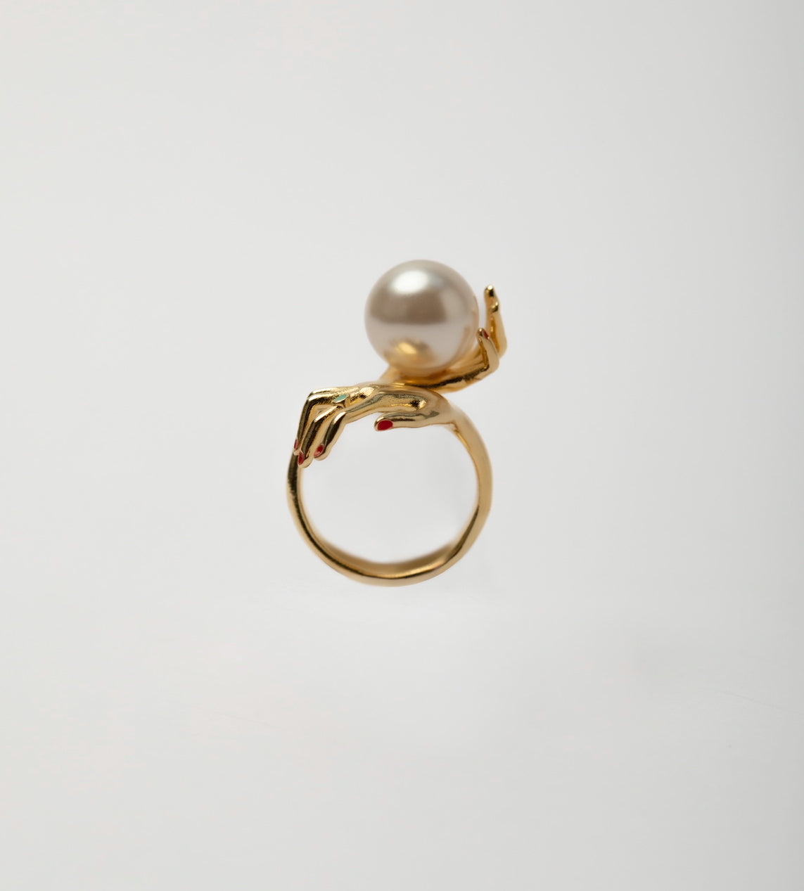 Una mano sorregge una perla, l’altra abbraccia il dito, trasformando un gesto semplice in un simbolo prezioso. Un design scultoreo e ironico, pensato per chi ama gioielli statement che non passano inosservati.