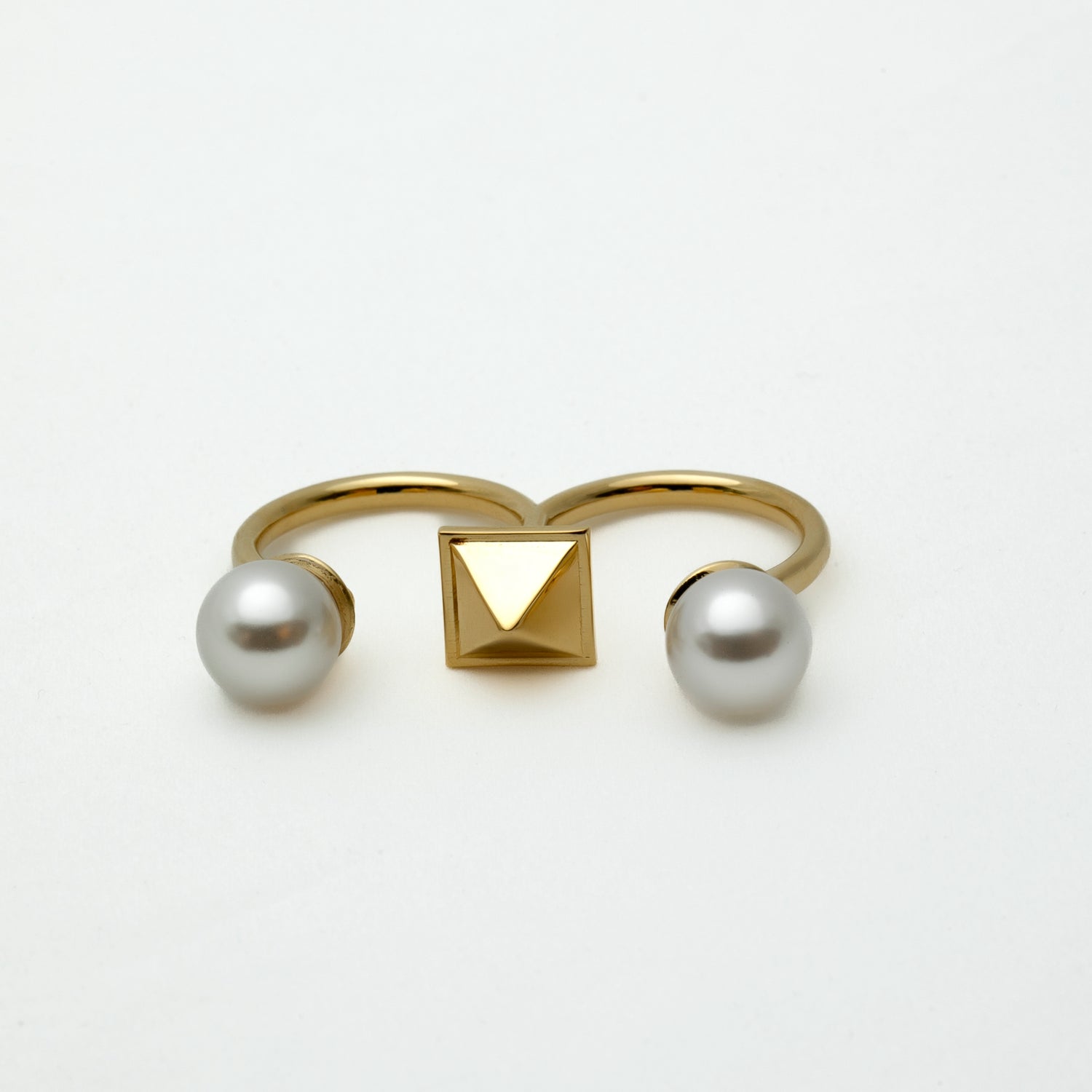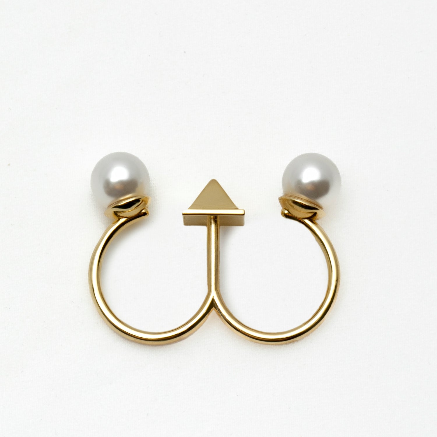 L'anello regolabile due dita Karina, della capsule Pearls Lover Vivyinrosa, è realizzato in placcatura oro di altissima qualità ed è ipoallergenico.